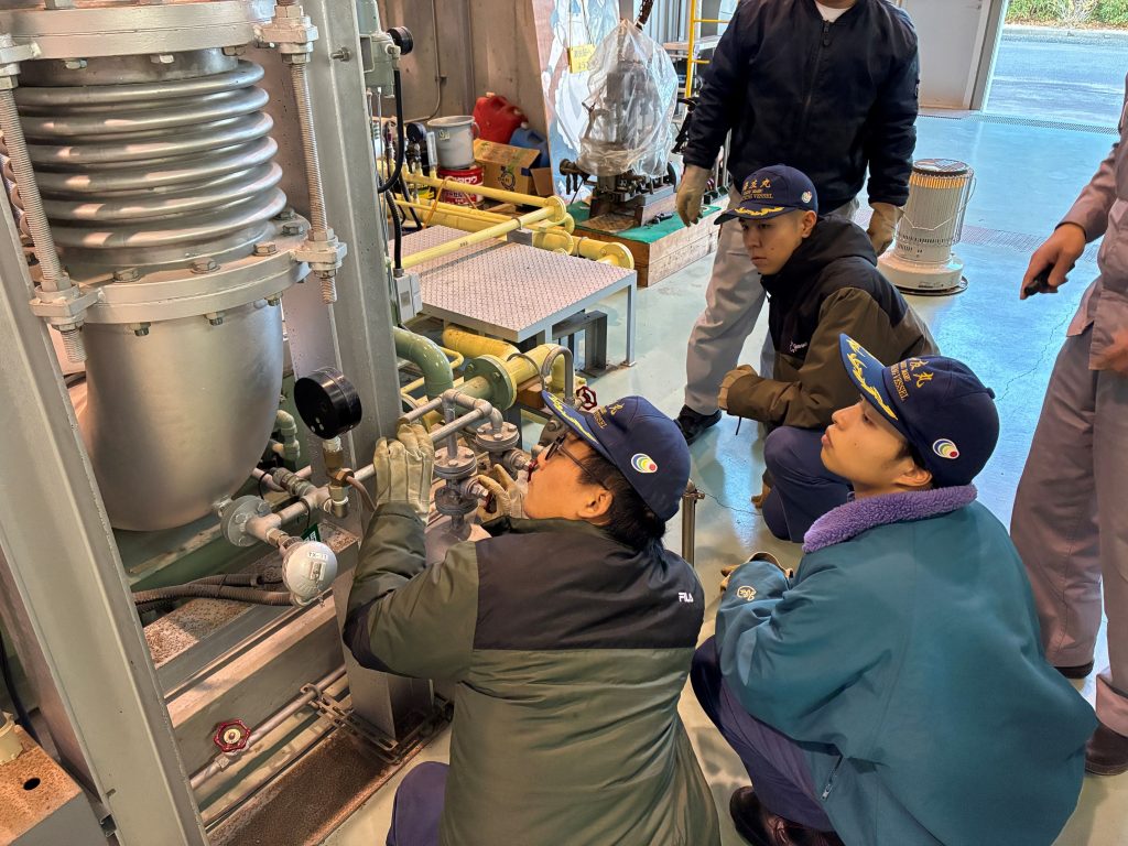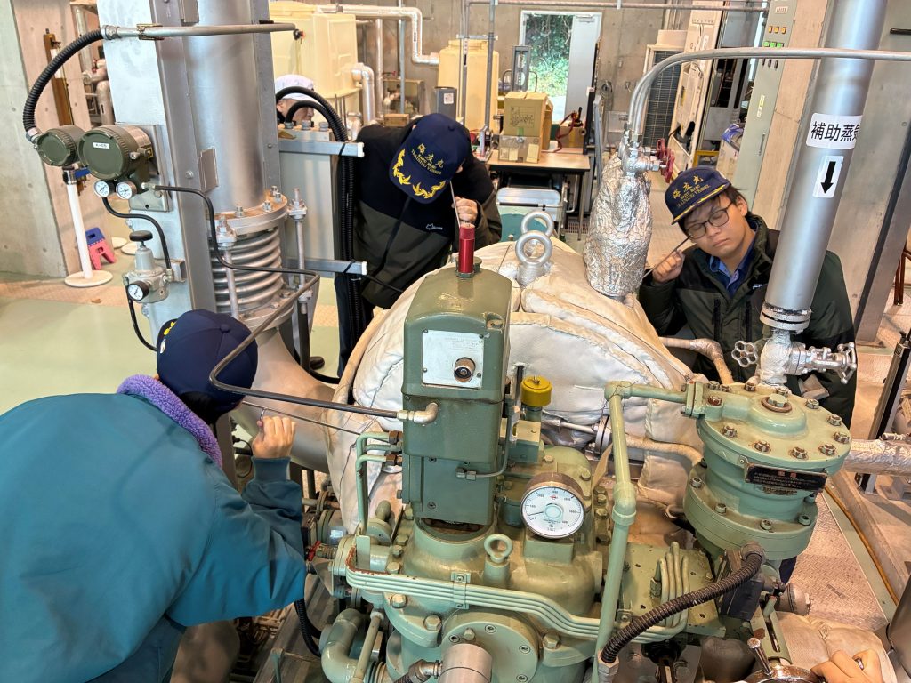 2026年1月13日に 山口県立大津緑洋高等学校から3名の高校生が来校され、本校の舶用機械総合実験棟で蒸気タービンプラント研修を実施しました。