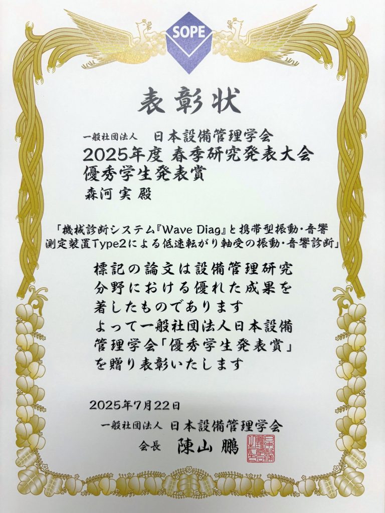 海洋機械工学科の学生が学会で優秀学生発表賞を受賞しました 2026/01/21Wed お知らせ 海洋機械工学科 太田 博光 学科長の研究室に所属する森河 実さん(現在は水産学研究科)が、2025年度 日本設備管理学会 春季研究発表大会にて「優秀学生発表賞」を受賞しました。 今回の受賞は、「機械診断システム「Wave Diag」と携帯型振動・音響測定装置Type2による低速転がり軸受の振動・音響診断」の発表内容が高く評価されたものです。おめでとうございます。